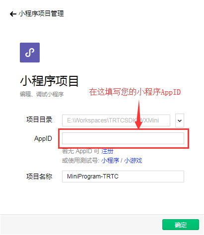 - 输入您申请到的微信小程序 AppID(注意:不是上面的 SDKAppID),项目目录选择上一步下载到的代码目录( 注意: 目录请选择根目录,根目录包含有