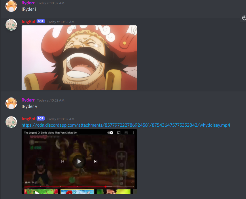 ImgBot works online and when a user post a video or image the bot will catalog it into one of the two folders, and then when it is prompted later will grab a random image or
