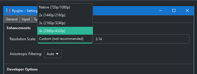 If you're using a 1080p screen, I recommend 2x scaling (don't go above, you will lose super sampling). For 4K, I recommend 2x or greater - though you should only go higher when your GPU can definitely handle it. Remember, 4x (8K) is 16x the switch's pixel count!
