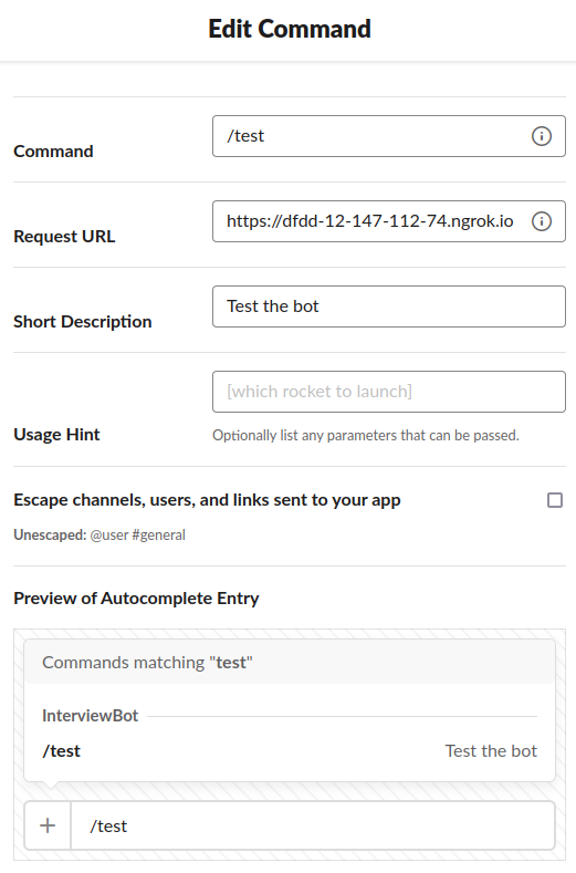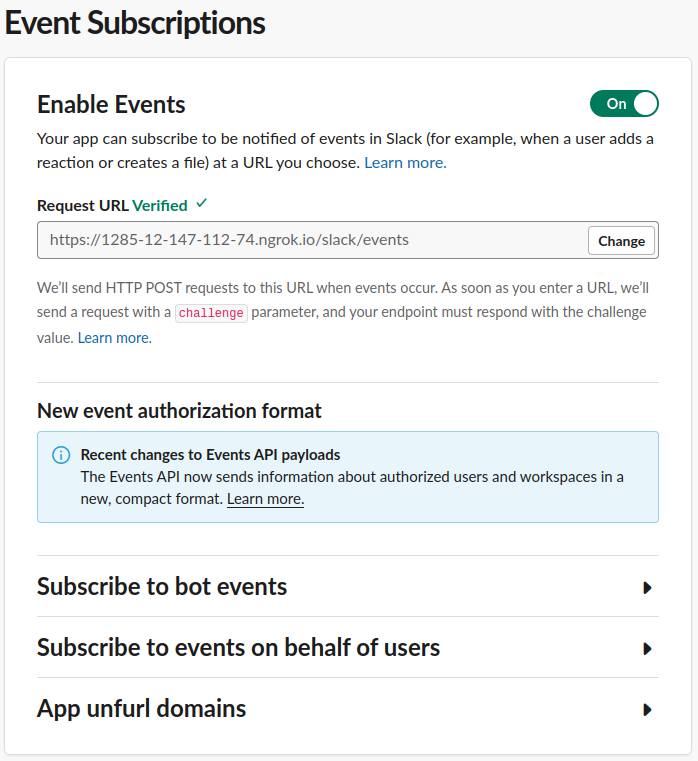 - Copy ngrok's forwarding address to your app settings in api.slack.com