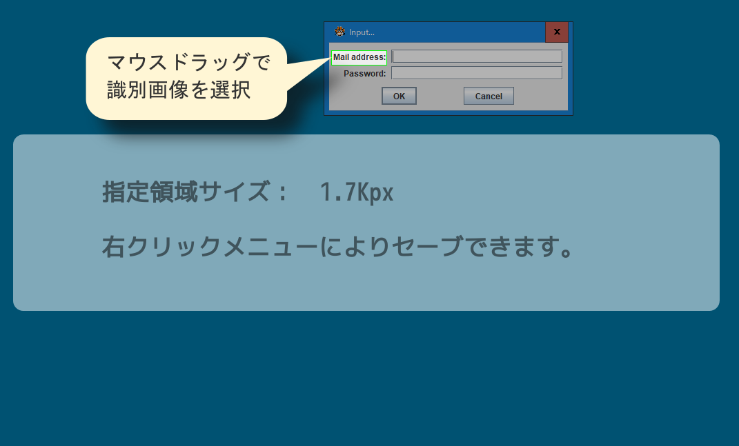 入力画面を識別するための画像パターンを決めて、マウスのドラッグにより矩形の領域を選択します。
