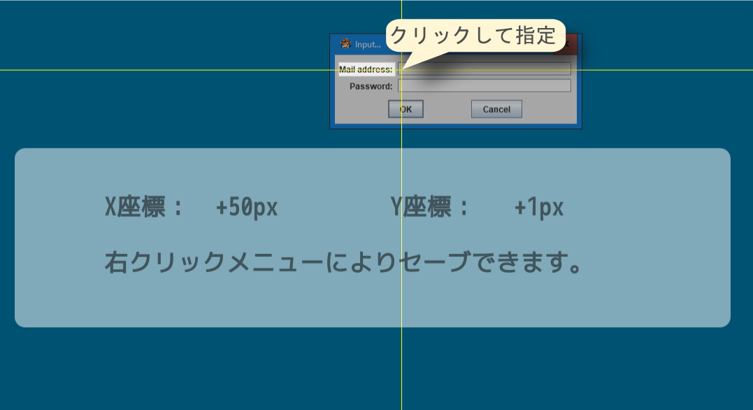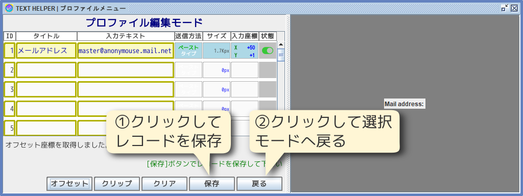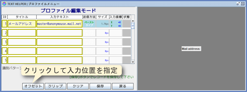 編集メニューで[オフセット]ボタンをクリックして、テキストを送信する位置を指定するための座標取得ツールを起動します。