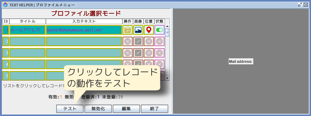 [テスト]ボタンをクリックして、レコード単体での動作テストが出来ます。