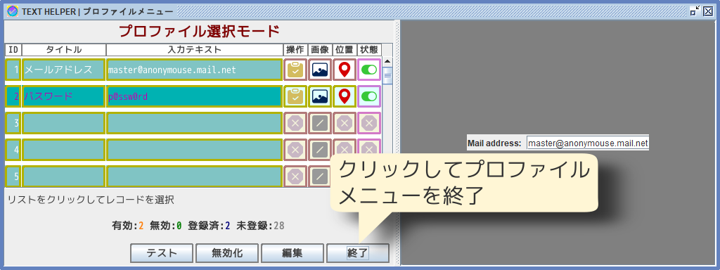 右クリックメニューから[セーブ]を選択すると、プロファイルに登録されます。