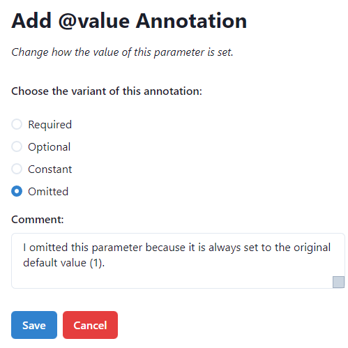 annotation now has a fourth variant "omitted". It can only be used on optional parameters. This variant omits the parameter from the parameter list of the wrapper function and the call to the original function. The parameter of the original function is, therefore, always set to the original default value.Compared to the "constant" variant this one does not have the issue that only literals can be used as values, since we never need to import anything in the wrapper files.