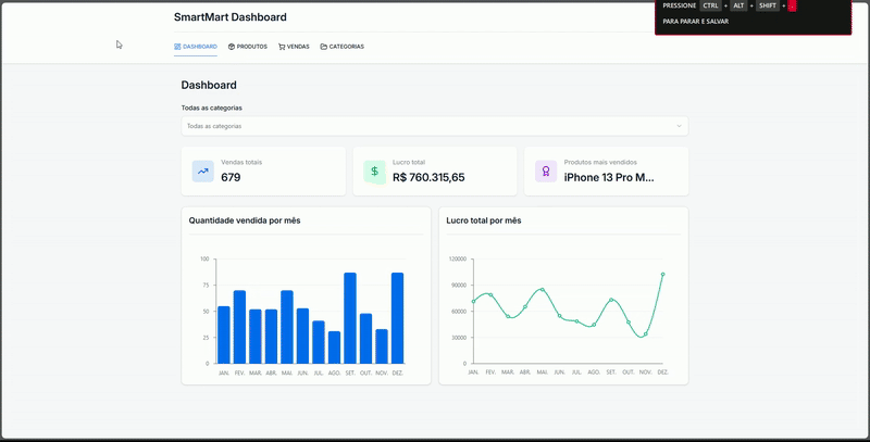 SmartMart is a product and sales management dashboard, designed to provide a clear and detailed overview of your business performance. With it, you can register products, import data in bulk, view sales, profits, and much more.