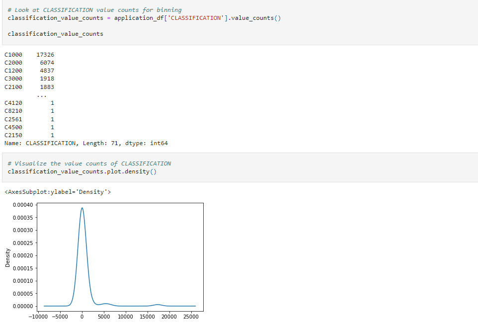 In the first iteration of the model created the first steps taken were removing unnecessary information from the CSV. That included the "Ein" and the "Name" column. The next step after checking unique values and also counting the values for each remaining column was to determine the appropriate number using a density chart for binning large values. The below example is for the Application column but the same process was done for the Classification column. Both columns had more that 10 values in comparision to the rest of the columns.