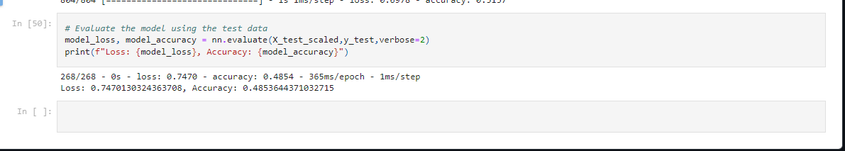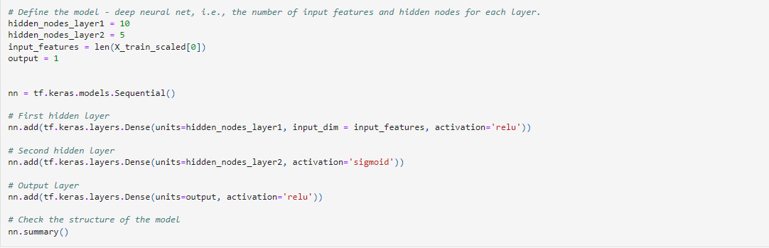 The first iteration of the model had two hidden layers. The first layer contained 200 neurons and the second contained 150. The number of neurons was determined based on the number of features. The first layer had a "relu" activation model and the second layer had a "sigmoid" activation. Once compiled and trained for 100 epochs the accuracy score was about 48%.