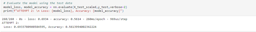 In the second attempt the pre-processing and model stayed mostly the same. This time the second layer changed from "sigmoid" to "relu" activation and the output layer was changed to "sigmoid"