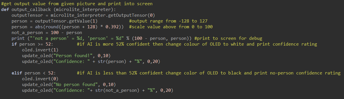 Output_callback function retrives AI condfidence values and print them to OLED screen. Microlite Outputs a Tensor value in signed 8-bit integer, namely from