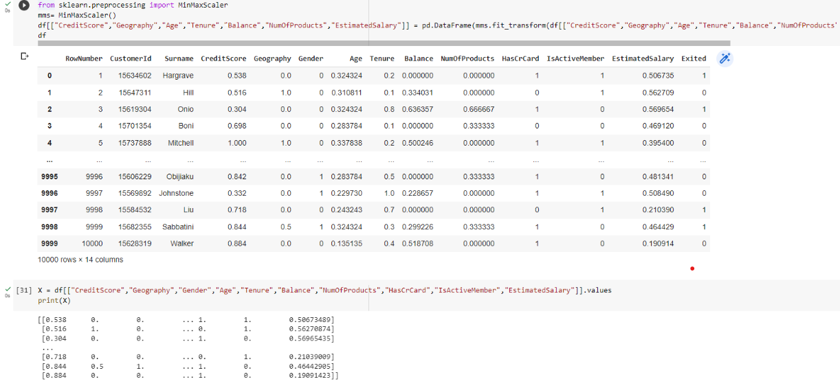 from sklearn.preprocessing import MinMaxScaler mms= MinMaxScaler() df[["CreditScore","Geography","Age","Tenure","Balance","NumOfProducts","EstimatedSalary"]] = pd.DataFrame(mms.fit_transform(df[["CreditScore","Geography","Age","Tenure","Balance","NumOfProducts","EstimatedSalary"]])) df