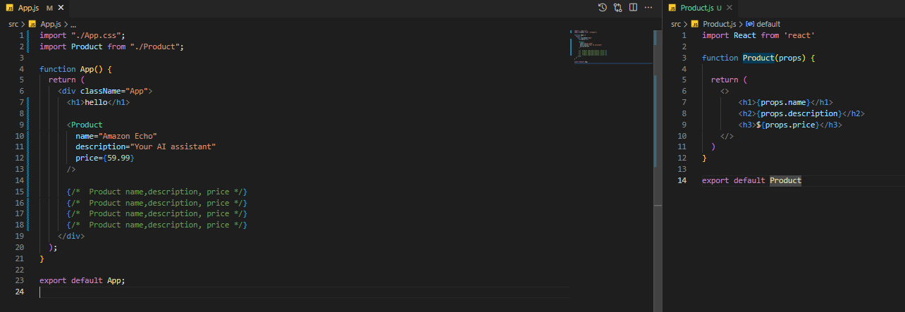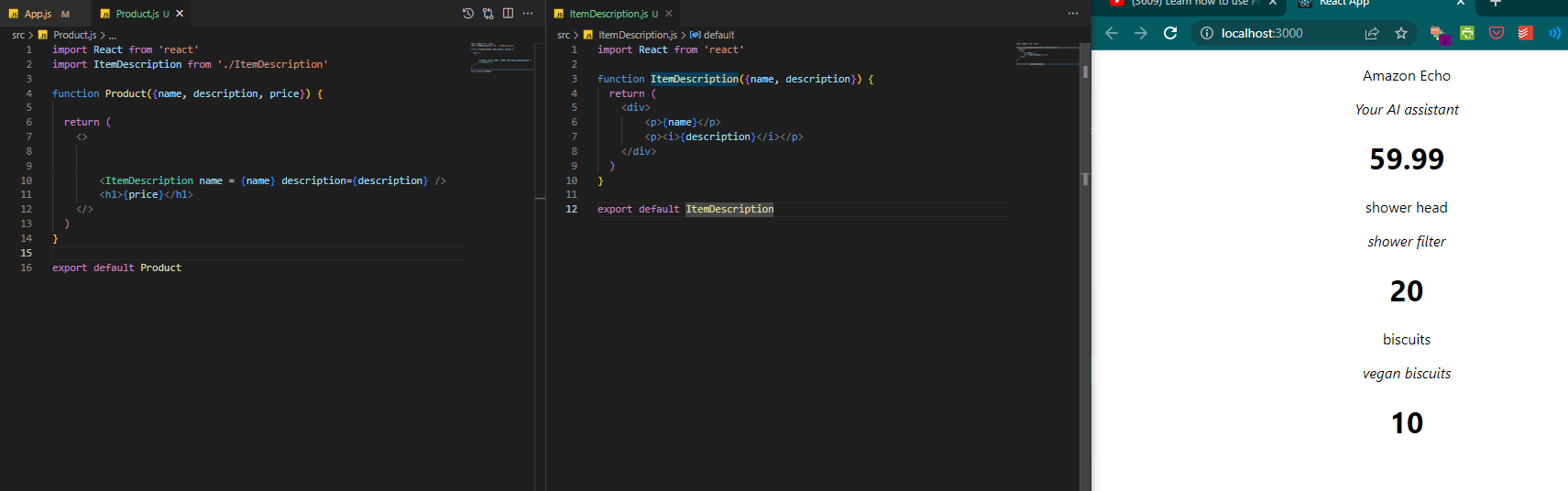What I have done in App.js is created a component called Product which will have 3 props = name, description, price.