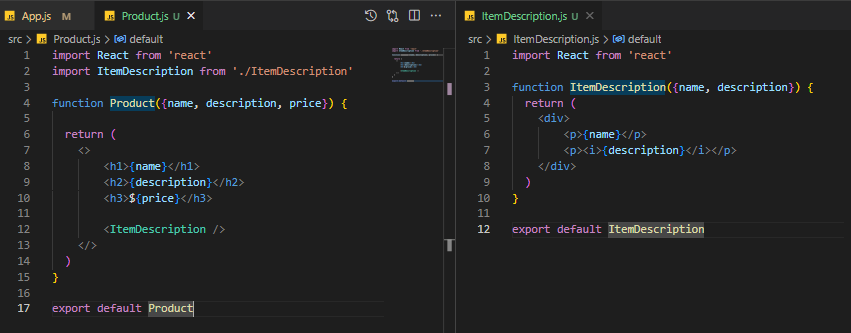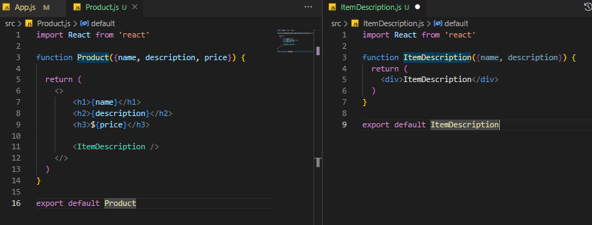 And now what we need to do now is create a sub component called ItemDescription and pass the props down to that one (remember tree structure can only pass down prop)