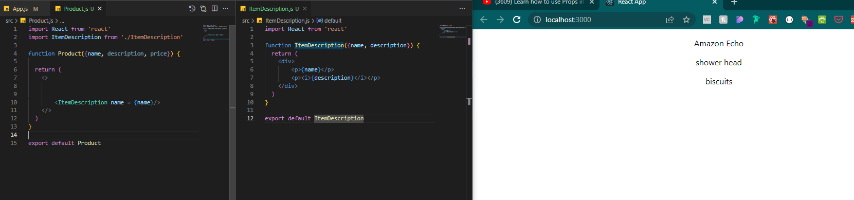 And what i have done in the Product.js is , first of all created a component called Product and passed props into the parameter and also passed the 3 props i created in the App.js