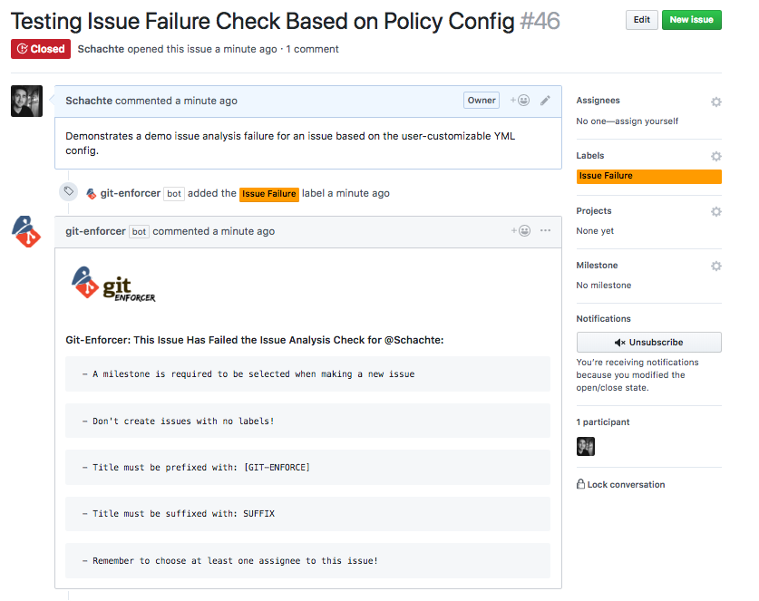 Git Enforcer is an open-source linter bot to faciliate collaboration efforts. Git Enforcer validates user-defined pull request structure, ensures approval requests don't go stale, validates issues follow a specific format, sends SMS alerts on PR status checks, allows for label customizability & more!
