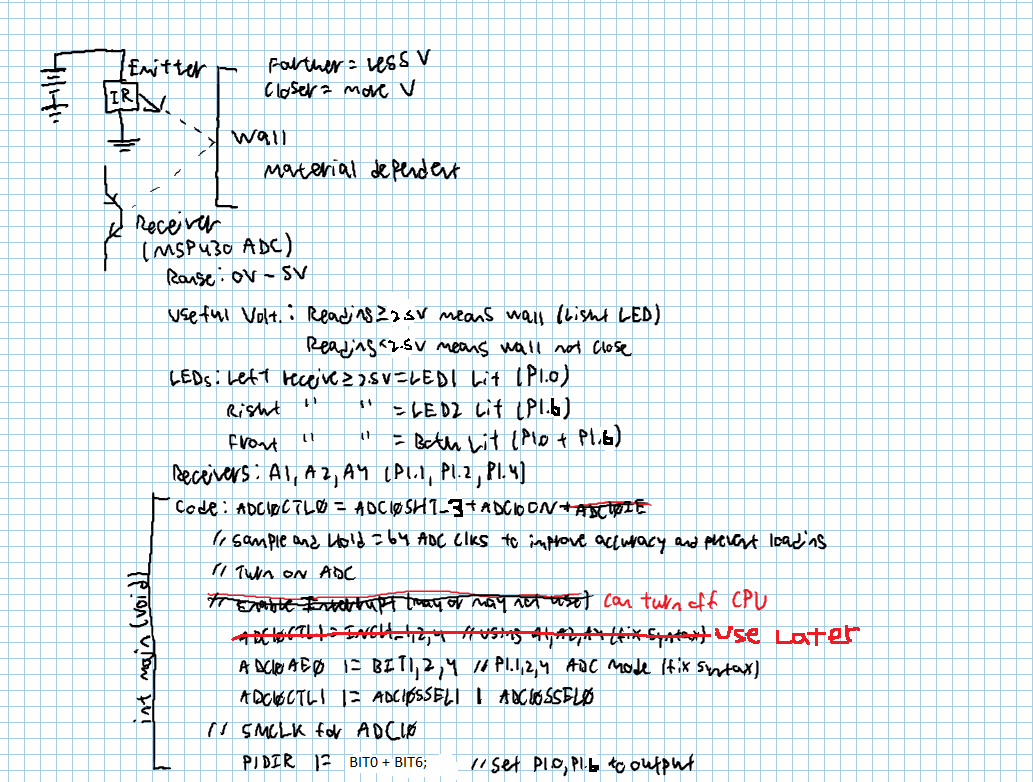 Ran the program through the debugger to see how ADC10MEM would change - found that the center and left receivers would read a lower voltage as an object got closer as opposed to the higher-voltage-if-a-wall-is-closer idea. Right receiver worked normally. This also changed the threshold values since each receiver was different. I had to find the base line voltages and then the voltages for when a wall was close to each receiver. This resulted in the threshold constants in the above code.