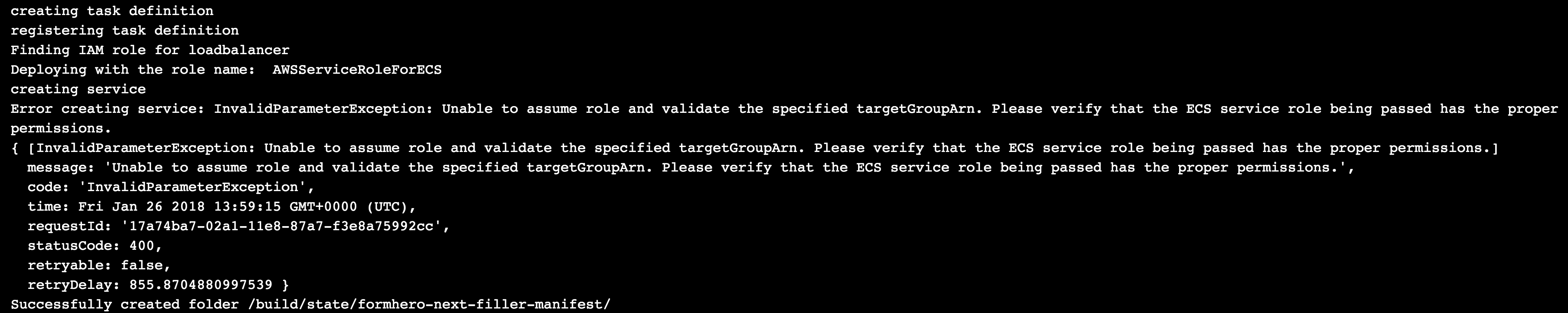 Our deploy is running using our 'smartforms-deploy-creds-formhero' AWS Keys integration, using this IAM user: arn:aws:iam::595008428611:user/shippable-deploy. That user has admin privileges and explicitly has STS Assume Role permissions for all roles.