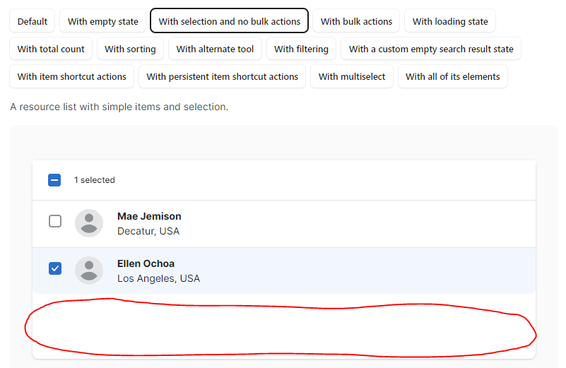 Included screenshots taken from https://polaris.shopify.com/components/resource-list, "With selection and no bulk actions".