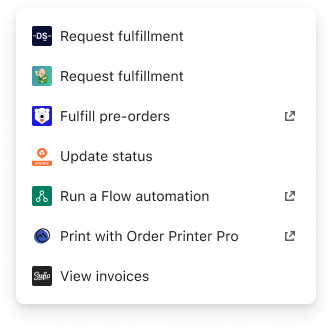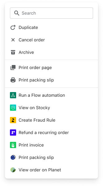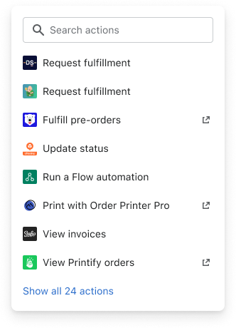 Actions are used to interact with resources as well as launch apps. Adding a search box and a "show {n} more" link allows Merchants to better find the action they're looking for.
