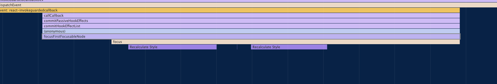 Use the performance tab and make sure focus first focusable node is not running rampant. Sample code with two trap focuses below