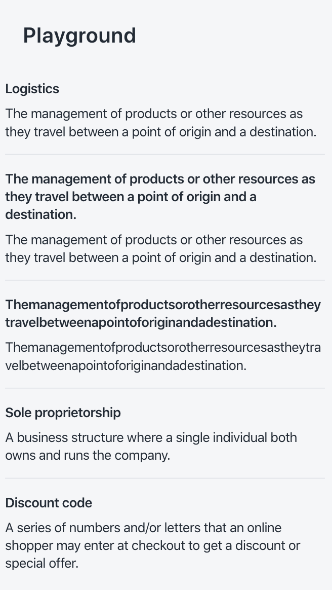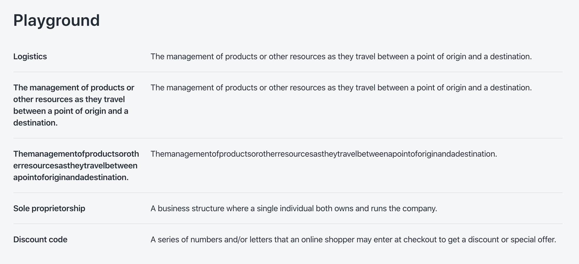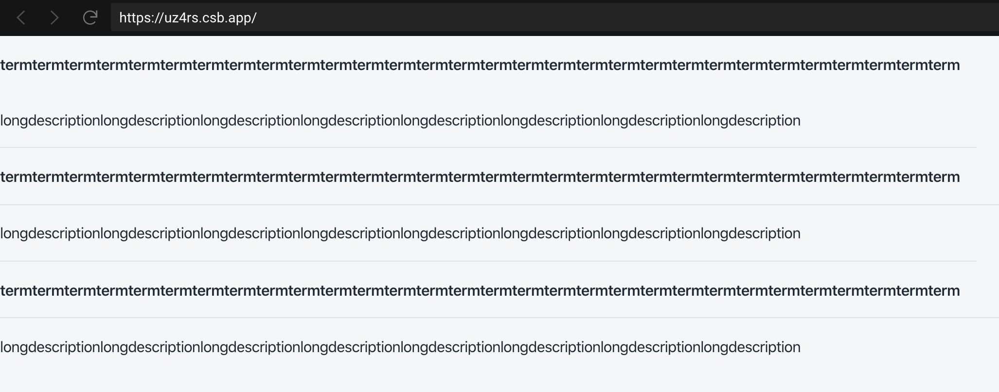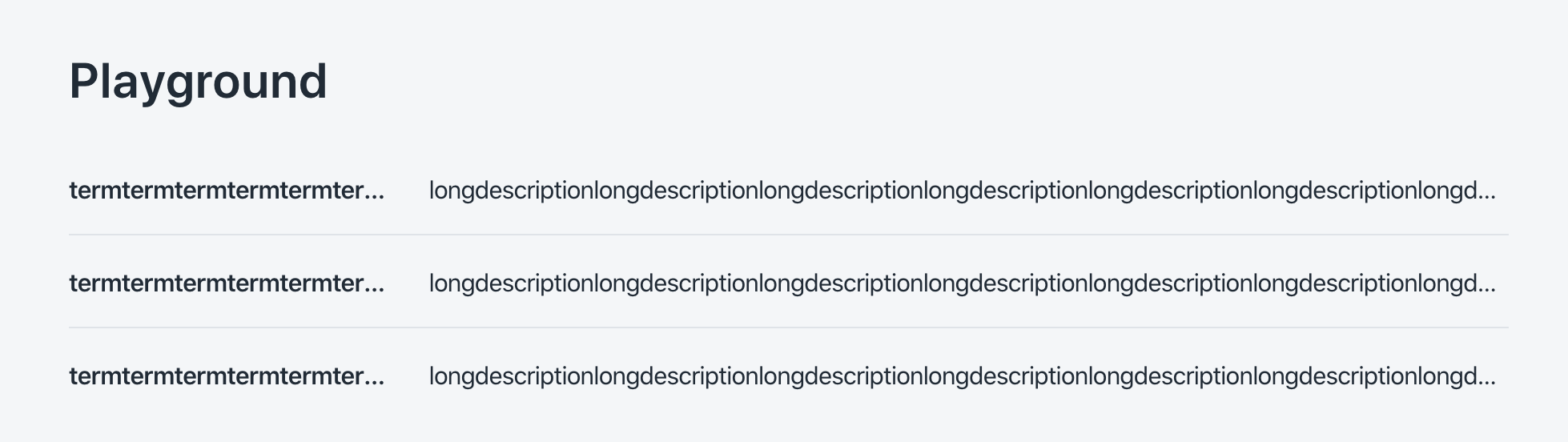 Thanks for catching this, Marc! Adding word-break: break-word to .DescriptionList is all that's needed here to prevent overflow and enable long words to wrap like regular sentences do. If you need the content to be truncated instead of wrapping, you can wrap with Truncate.