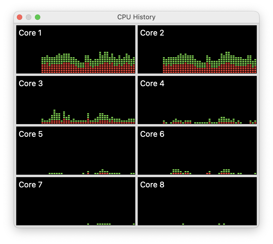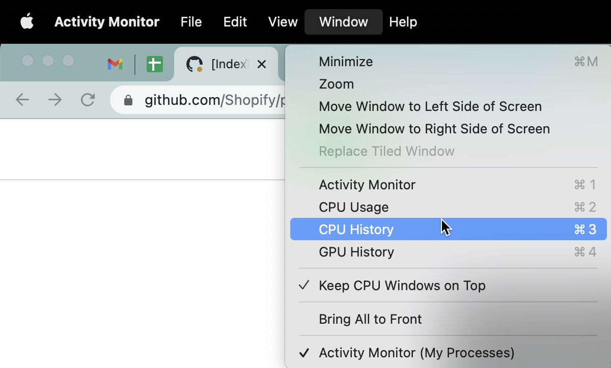 The old skeleton shimmer animation would overload CPU on Shopify Macbooks. The removal PR suggests "Slight performance problems", but multiple Macbooks recorded >400% CPU usage just from the animation. @colinbendell looked into accelerating the animation, but others were adamant about removing it regardless of performance improvements. I used MacOS's The CPU history looks like this: |