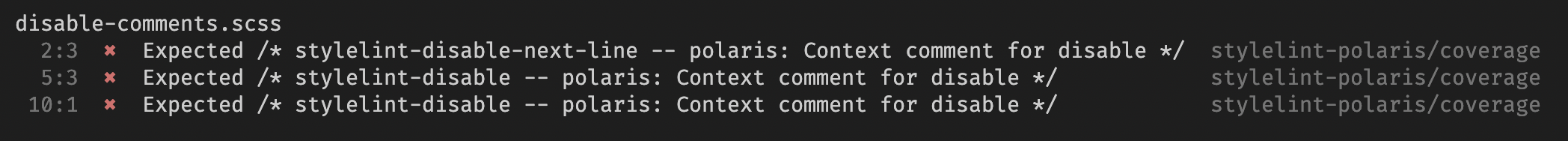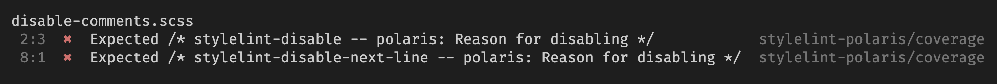 // Ensure all stylelint-polaris/coverage disable comments | ||