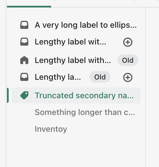 There is a new story for the truncation enabled items. Here you can see anything going beyond the width of the text container will be truncated with ellipsis. Notice that "Inventory" is fine as it not long enough to trigger it. Secondary navigation items are also treated the same as their parent.