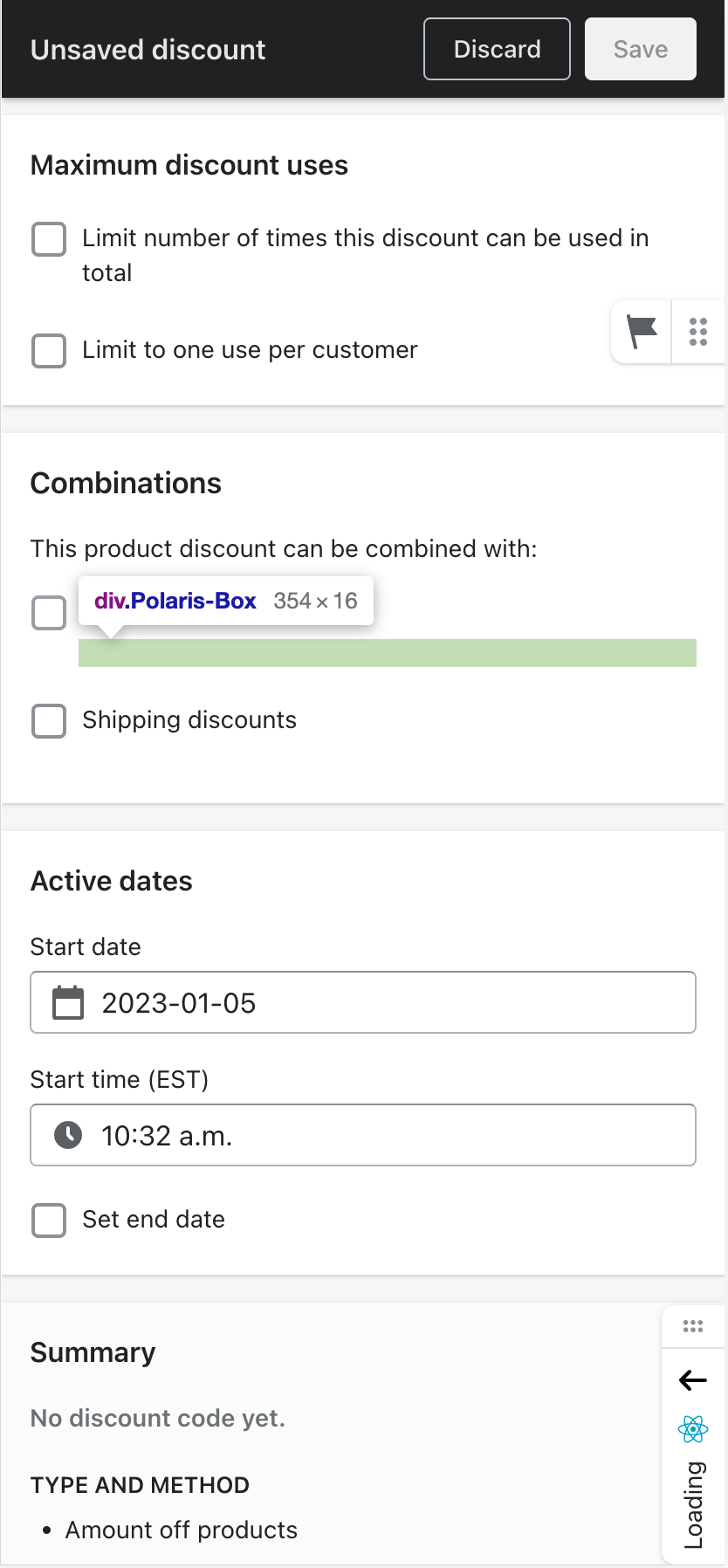I found it after clicking around on the discount page. I think we'll need to not render children if they're not present in this case since it is margin collapse. Wonder if that could cause issues though Edit I think the above is an implementation issue. Children shouldn't be rendered unless that option is selected. I'm creating a better example to showcase this |