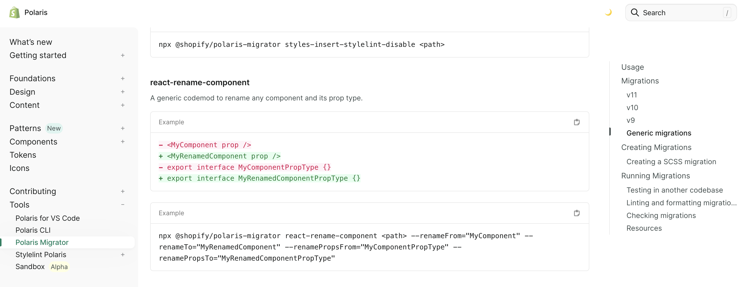 …emod (Shopify#8986) ### WHY are these changes introduced? Adds documentation for the `react-rename-component` migration so we can link to it for the what's new page for v11 for layout. ### WHAT is this pull request doing? Updates style guide documentation for polaris migrator. <details> <summary>New documentation</summary> <img src="https://user-images.githubusercontent.com/26749317/232557876-7166bde1-0c2f-447d-bae3-ce1574e8e1ab.png" alt="New documentation"> </details> <!-- ℹ️ Delete the following for small / trivial changes --> ### How to 🎩 🖥 [Local development instructions](https://github.com/Shopify/polaris/blob/main/README.md#local-development) 🗒 [General tophatting guidelines](https://github.com/Shopify/polaris/blob/main/documentation/Tophatting.md) 📄 [Changelog guidelines](https://github.com/Shopify/polaris/blob/main/.github/CONTRIBUTING.md#changelog) ### 🎩 checklist - [ ] Tested on [mobile](https://github.com/Shopify/polaris/blob/main/documentation/Tophatting.md#cross-browser-testing) - [ ] Tested on [multiple browsers](https://help.shopify.com/en/manual/shopify-admin/supported-browsers) - [ ] Tested for [accessibility](https://github.com/Shopify/polaris/blob/main/documentation/Accessibility%20testing.md) - [ ] Updated the component's `README.md` with documentation changes - [x] [Tophatted documentation](https://github.com/Shopify/polaris/blob/main/documentation/Tophatting%20documentation.md) changes in the style guide