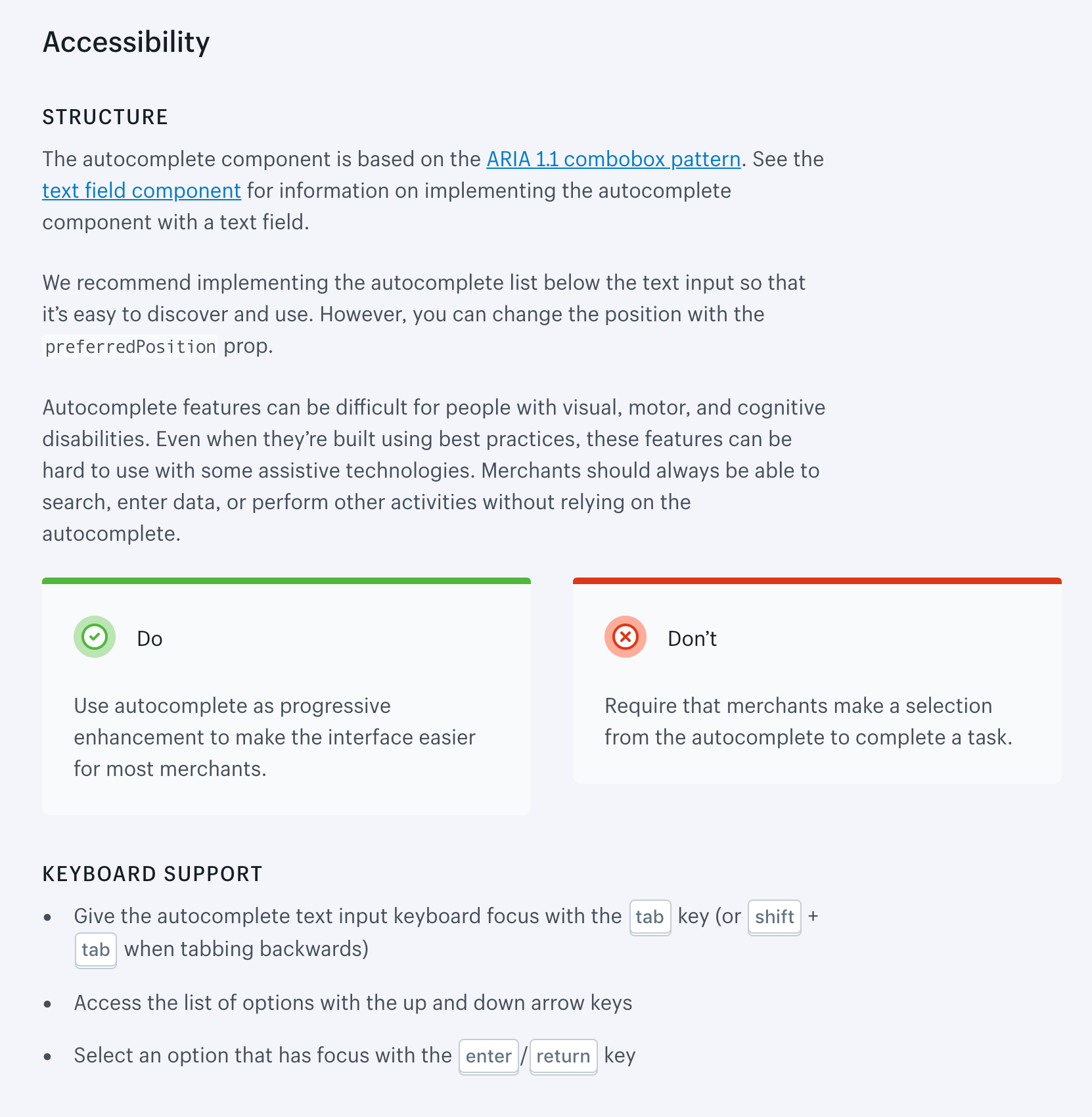 The autocomplete component is based on the [ARIA 1.1 combobox pattern](https://www.w3.org/TR/wai-aria-practices-1.1/#combobox). See the [text field component](https://polaris.shopify.com/components/forms/text-field) for information on implementing the autocomplete component with a text field. | ||