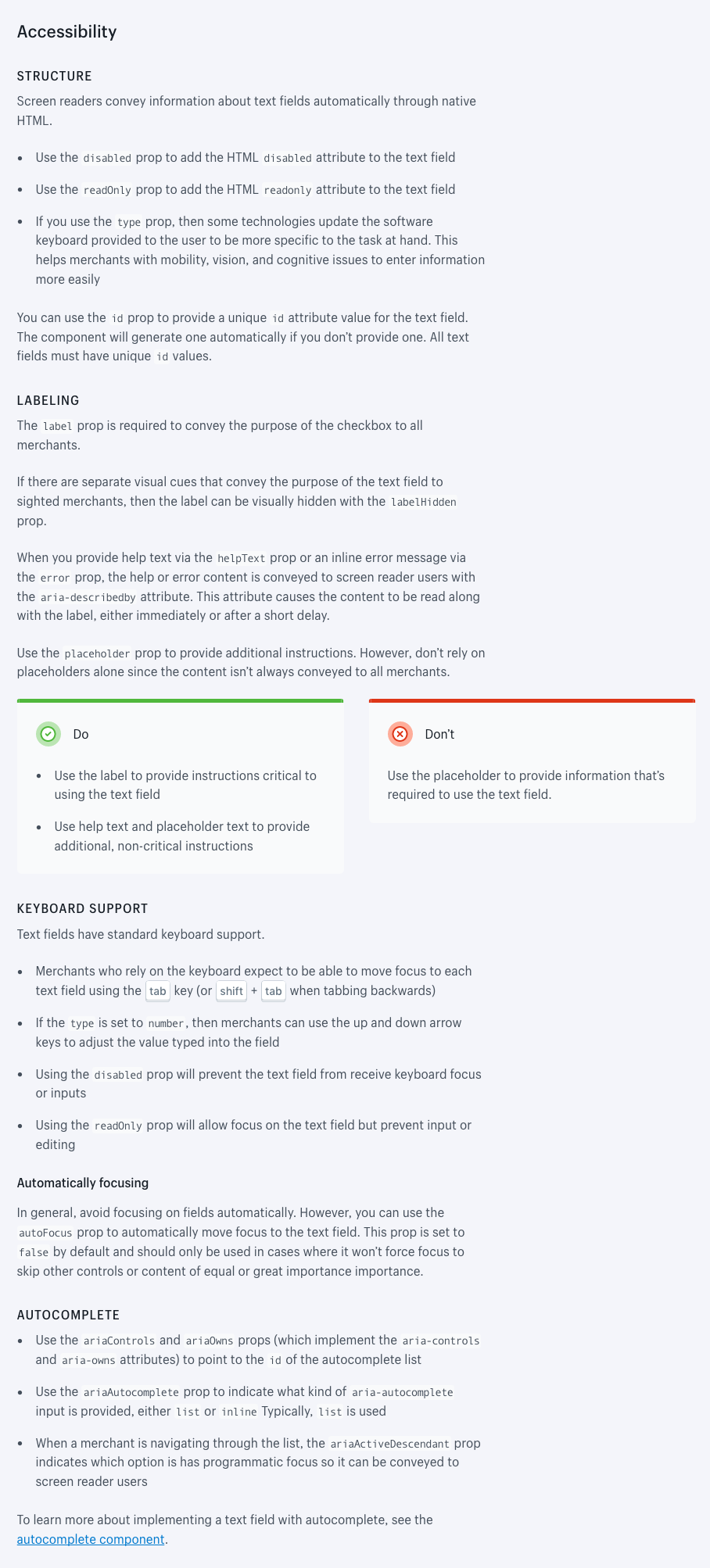 Provides guidance on using the text field and autocomplete components as part of accessibility documentation updates. These update are available in component docs on