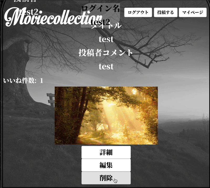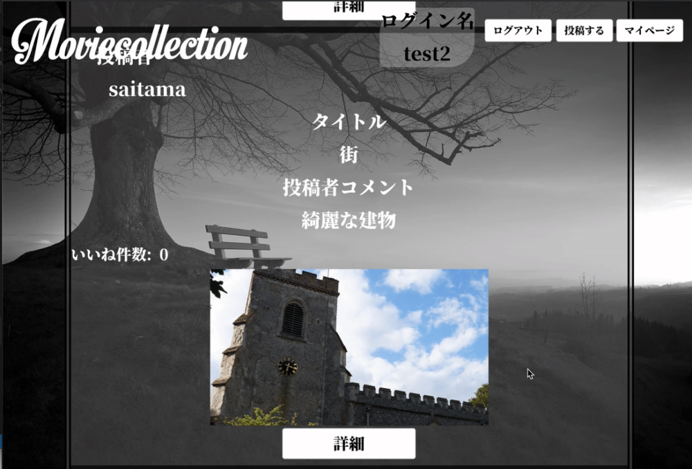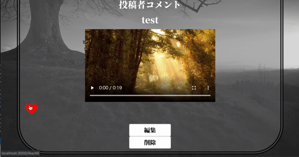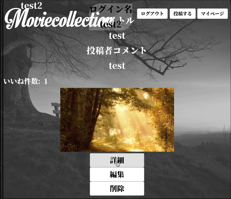 トップページでは投稿した動画の投稿者名、動画のタイトル、動画についてのコメントといいね数、動画のオート再生でどのような動画か表示させています。 投稿ユーザーは詳細、削除、編集ボタンが表示され、投稿していないユーザーは詳細ボタンのみ表示されます。