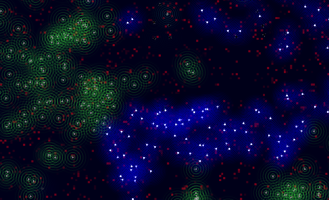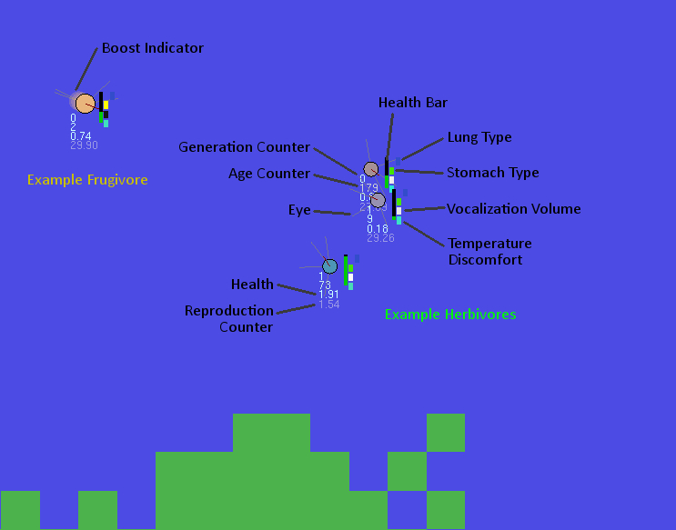 The basics of the sim are a large physical 2d space (the World) wherein bots (also known as agents) can interact with the world and each other, and attempt to persist. Each bot has a health bar, in the range (0,2], that allows them to continue operating. Their behaviors are widely varied, and are dictated by the Brain, a single-layered recursive network of Boxes. These boxes forward information (in the form of floating decimal values) from the senses via inputs, thru various biased, weighted, damped, and frozen connections, to the outputs, which directly control the movement and activity of the bots.