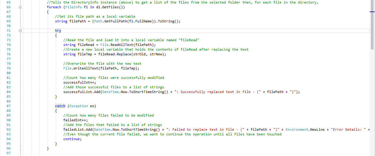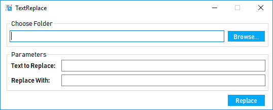 Small application to replace text across an unlimited amount of files, regardless of file type, in a user-selected directory. Commented for beginner-users. Included is the full source code for C# .NET (Visual Studio 2017 Solution.)