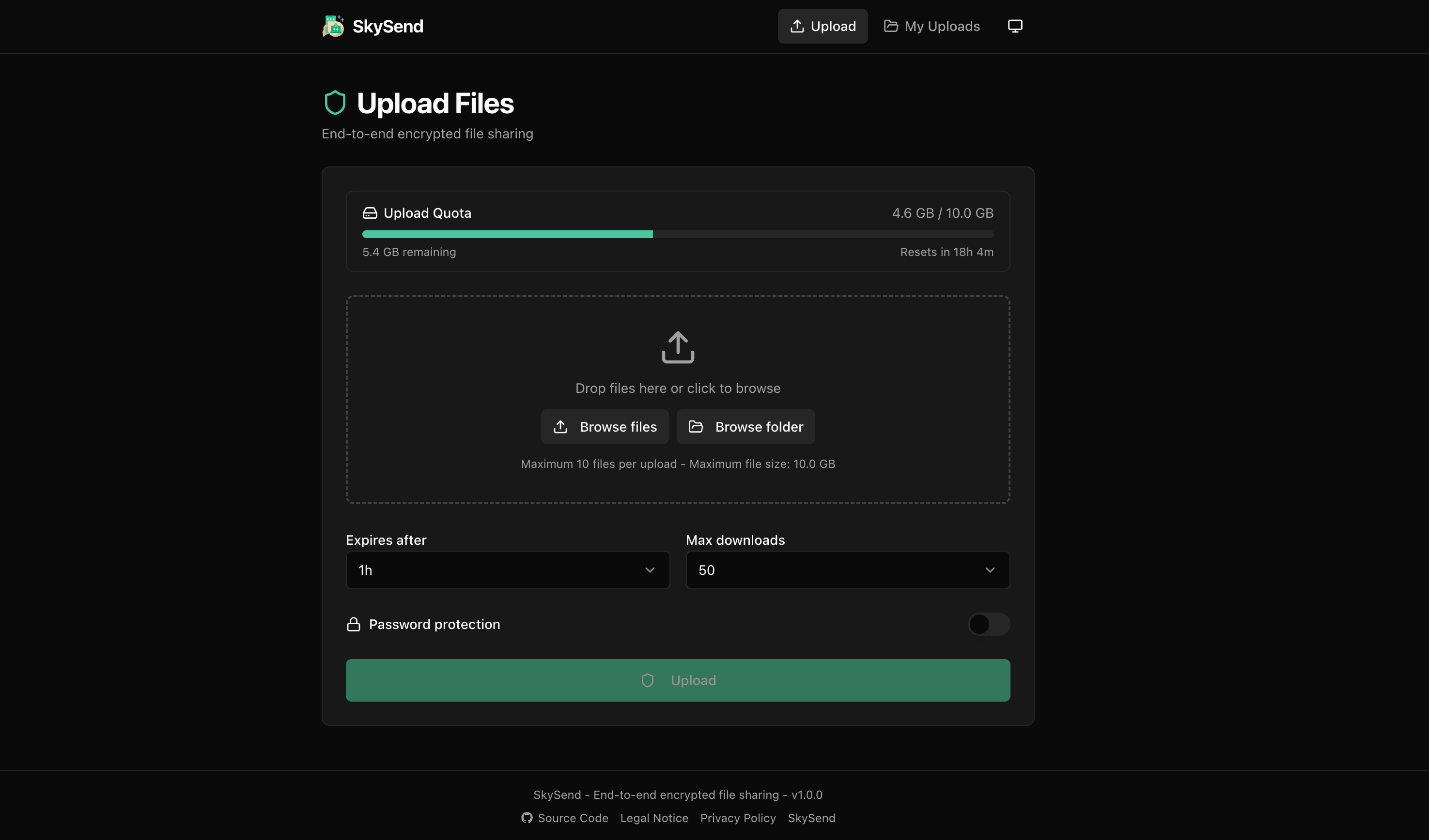 SkySend is a minimalist, self-hostable file sharing service with end-to-end encryption. Files are encrypted entirely in the browser using AES-256-GCM before they ever reach the server - the server stores only encrypted blobs and never has access to the decryption key.