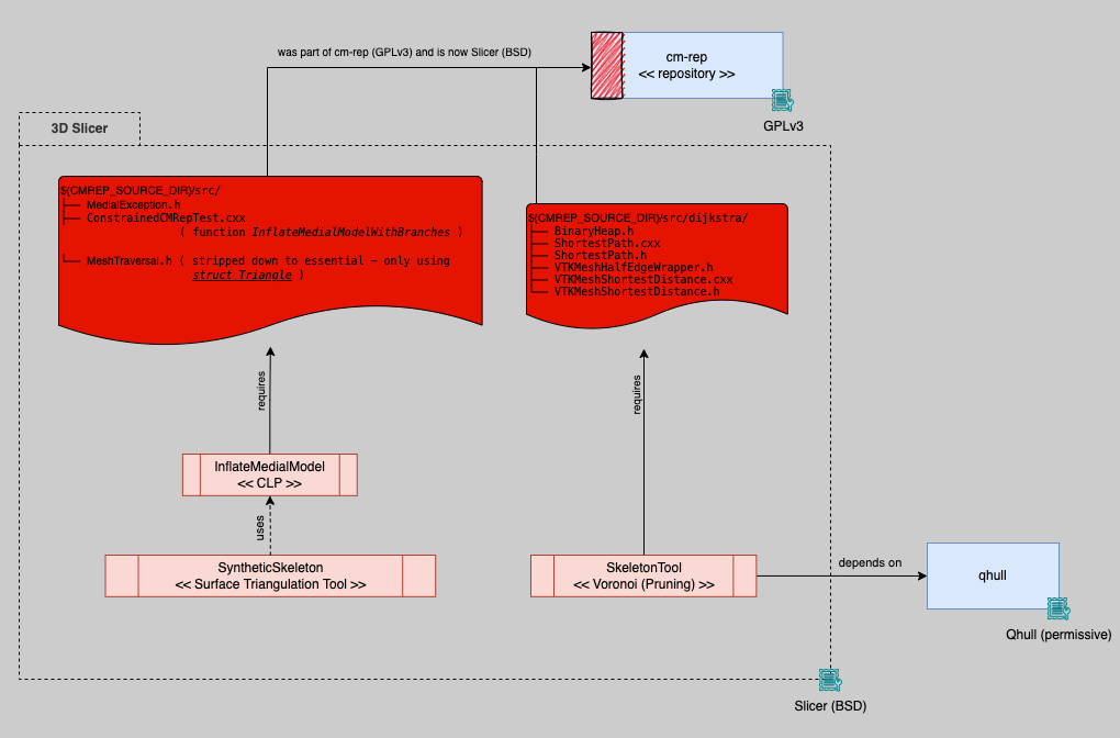 Everyone, the extension was renamed to "MedialSkeleton" and we received permission to distribute the required files (in the red boxes of the diagram) from the cm-rep repository under the Slicer BSD license. The resulting extension does not depend on cm-rep anymore so we don't have any license conflicts anymore. |
