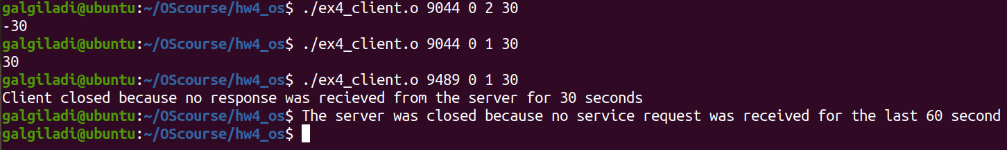- The client is waiting for a result from the server, but the client is not patient, so if client is waiting over 30 sec to a result, then we print "Client closed because no response was received from the server for 30 seconds".