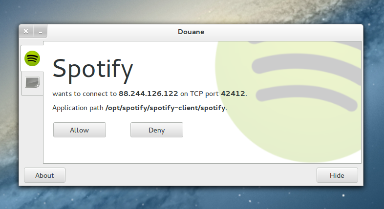 When Douane is started, it will watch the ougoing network traffic and as soon as an unknown application tries to send some network packets, Douane will block it and ask you if you allow it or not: