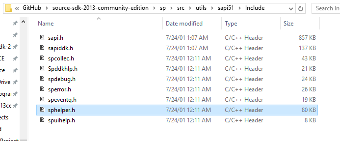 Microsoft Speech SDK 5.1.msi, copy the files to your source code folder. The path is<path-to-root>\sp\src\utils\sapi51. - You need to make some edits to sphelper.h before you continue: