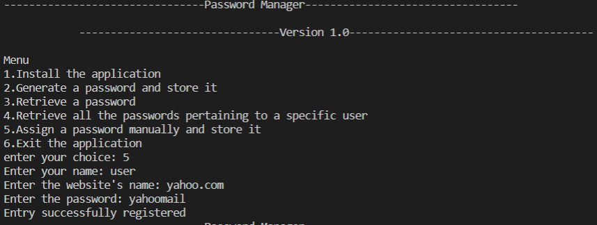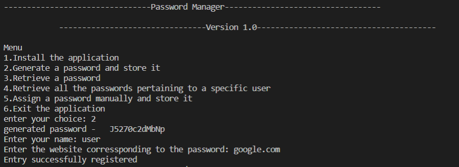 You can retrieve a password using option 3 in the menu. It will ask for username and website name and then gives the password.