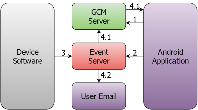 - After receiving notice from device, the vent server will send a message with events description on GCM server, which will send a message to Android app and/or user e-mail, specified in settings.
