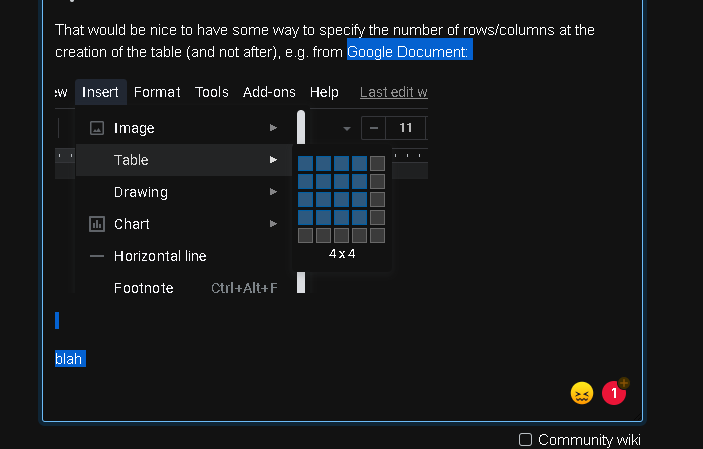 Images aren’t shown as selected, e.g. in the following I selected from “Google Document” to “blah” and the image wasn’t shown as selected (tested on Chrome with native dark mode+Windows):