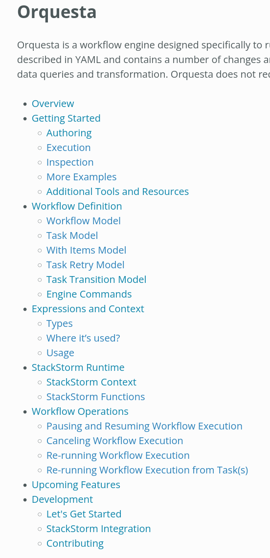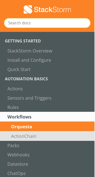 Currently, in the WorkFlows section of Automation Basics, we have a link to Orquesta, which is an index page of all the sub pages for Orquesta docs. It would be good if the index was visible in the sidebar when browsing the docs, otherwise one needs to return to this page over and over.