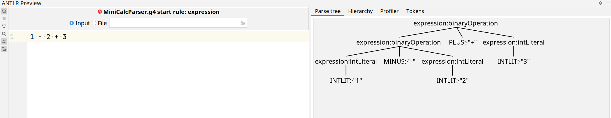Here we see that, according to ANTLR, 1 - 2 + 3 is supposed to be parsed as (1 - 2) + 3.