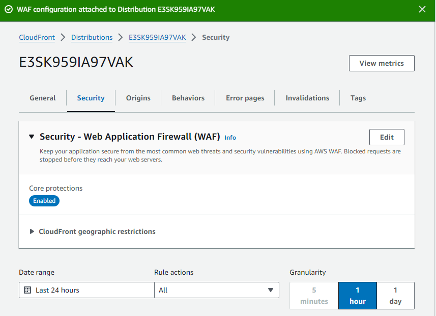 Figure 11: After using CloudFront to distribute my frontend application online, it now incorporates several security features including SSL for in-flight encryption, a WAF (Web Application Firewall) for private access, and ORN Shield to protect against malicious website attacks.