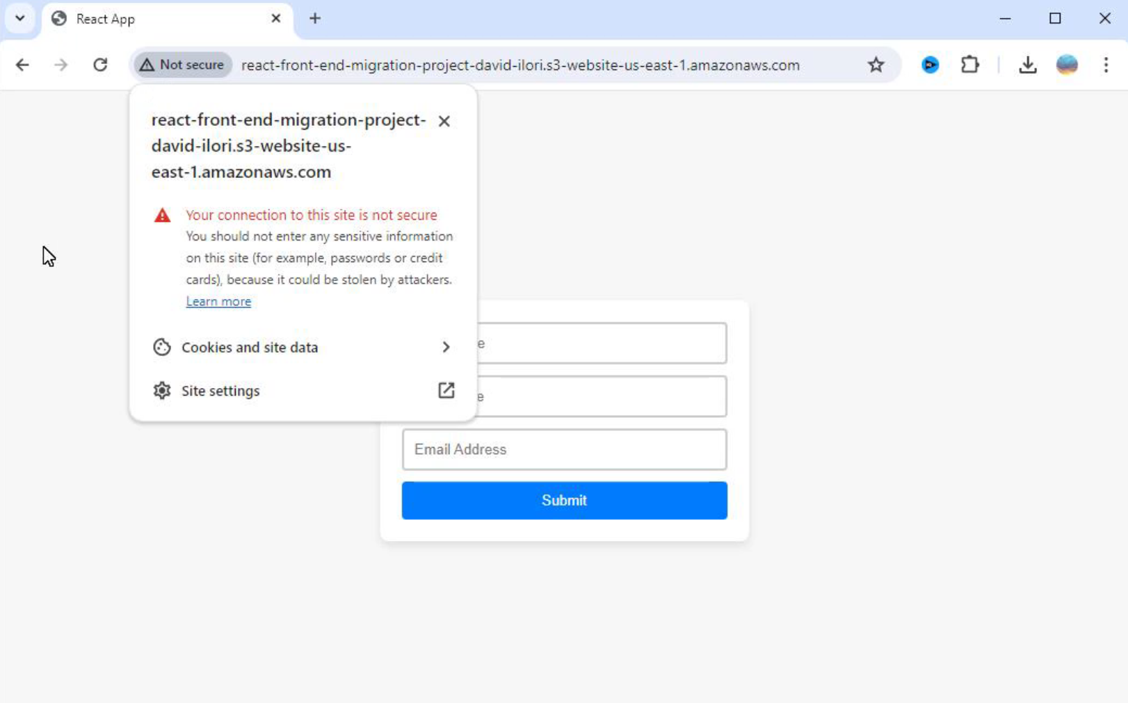 Figure 10: As mentioned earlier, although my frontend is now hosted in the cloud, additional measures, such as in-flight encryption, can be implemented to address security issues. In the next figure, I will demonstrate what the application looks like after using the AWS CloudFront service.