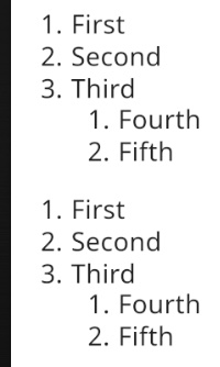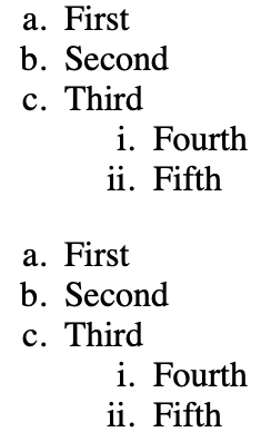 The first list with alpha numbers and indented list with roman numbers.