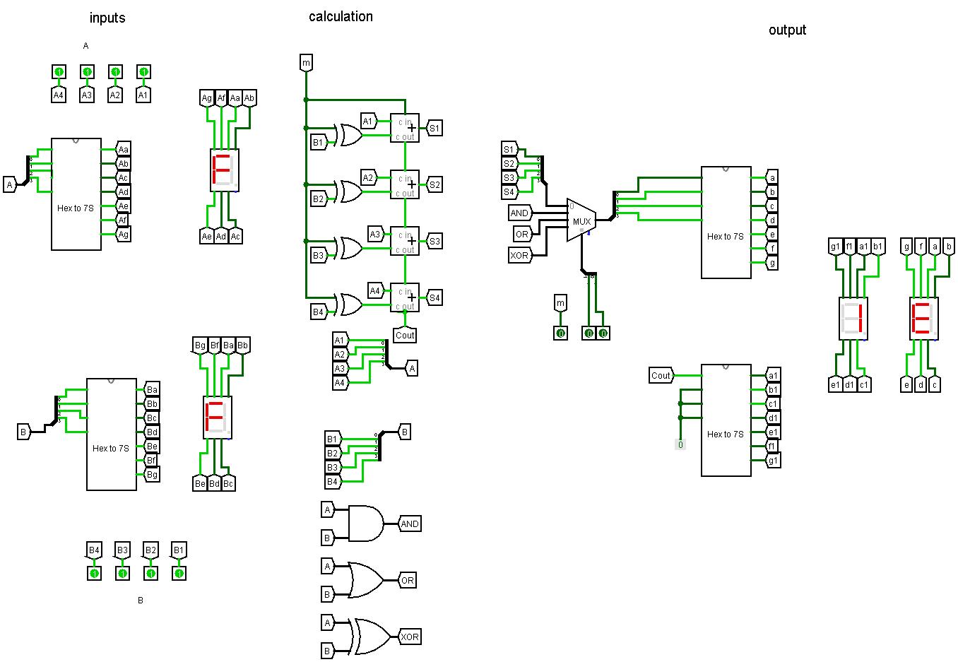 An arithmetic logic unit (ALU) that performs addition, subtraction, AND, OR, and Exclusive OR (XOR) is needed to be designed, the output and input should be displayed on a 7-segment display for the operands A (4-bit long) and B (4-bit long) using Logisim and Verilog
