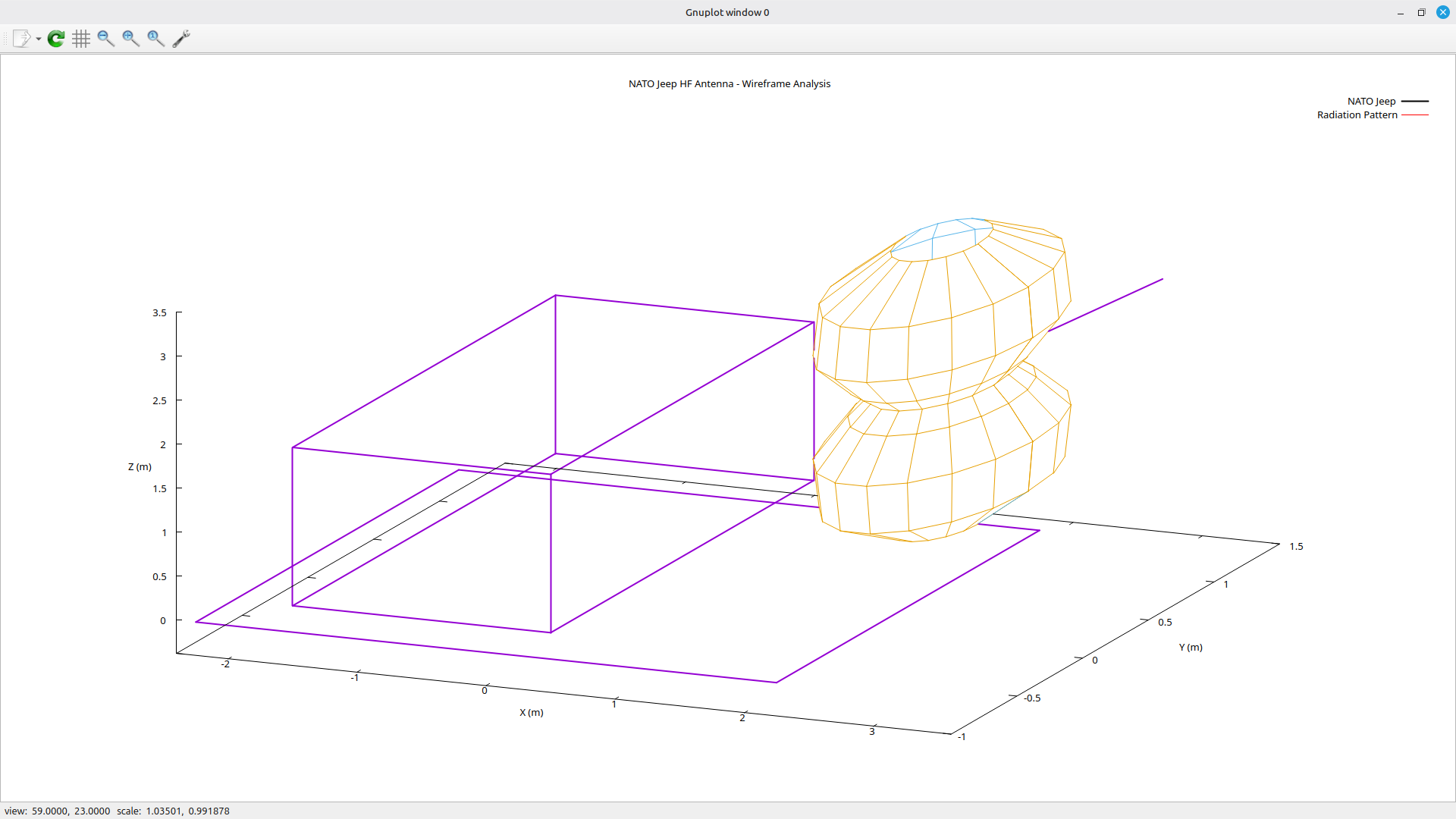 The system includes comprehensive antenna pattern visualization showing realistic radiation patterns for various vehicle types. The purple lines represent a basic, crude representation of a JEEP vehicle (sides and wheels not shown for clarity). The "8" figure demonstrates how a typical antenna tied down at a 45° angle radiates, providing realistic propagation modeling for ground-based vehicles.